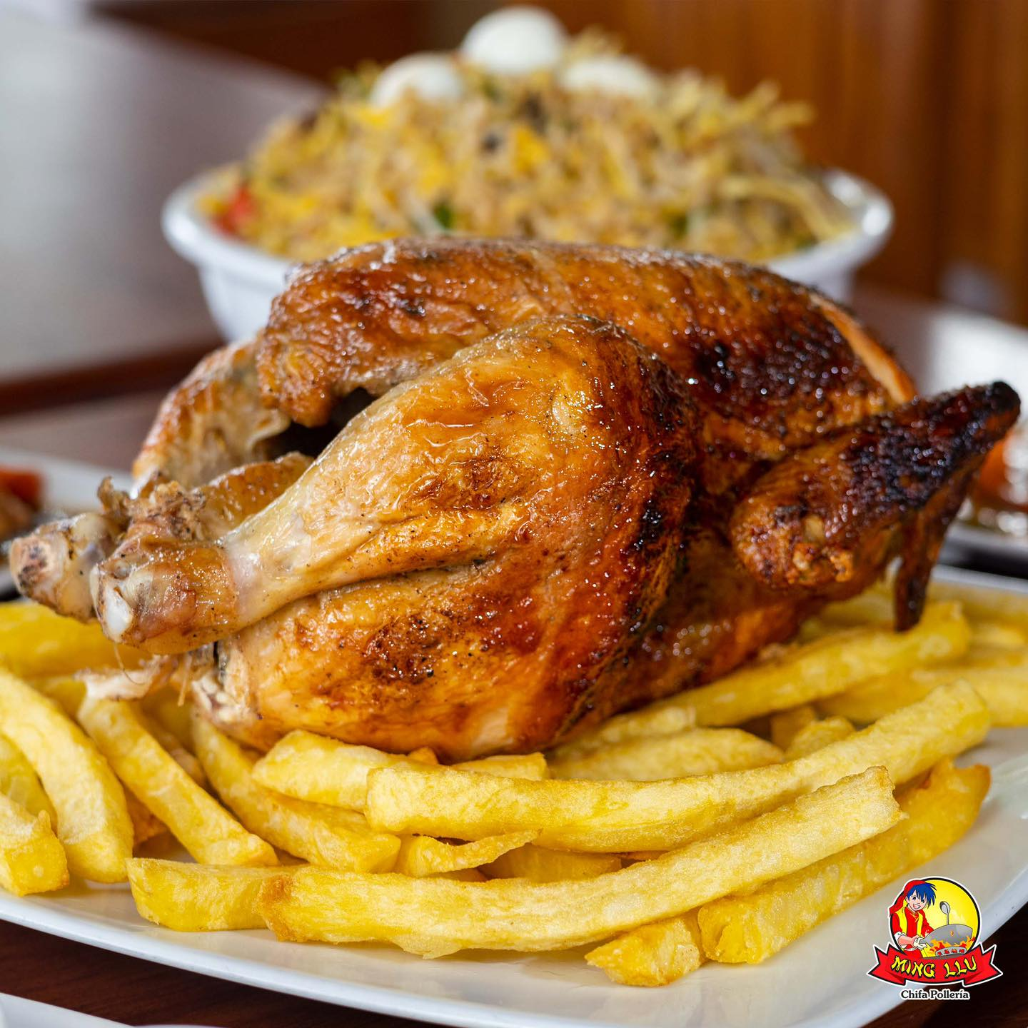 Pollo entero a la brasa acompañado de arroz chaufa y ensalada fresca.