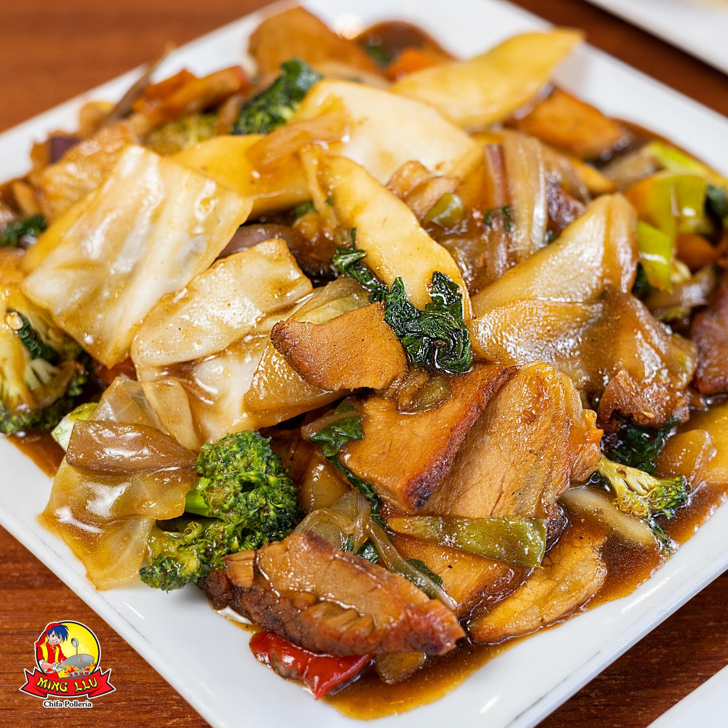 Media porción de ming llu con verduras, pollo y salsa especial.