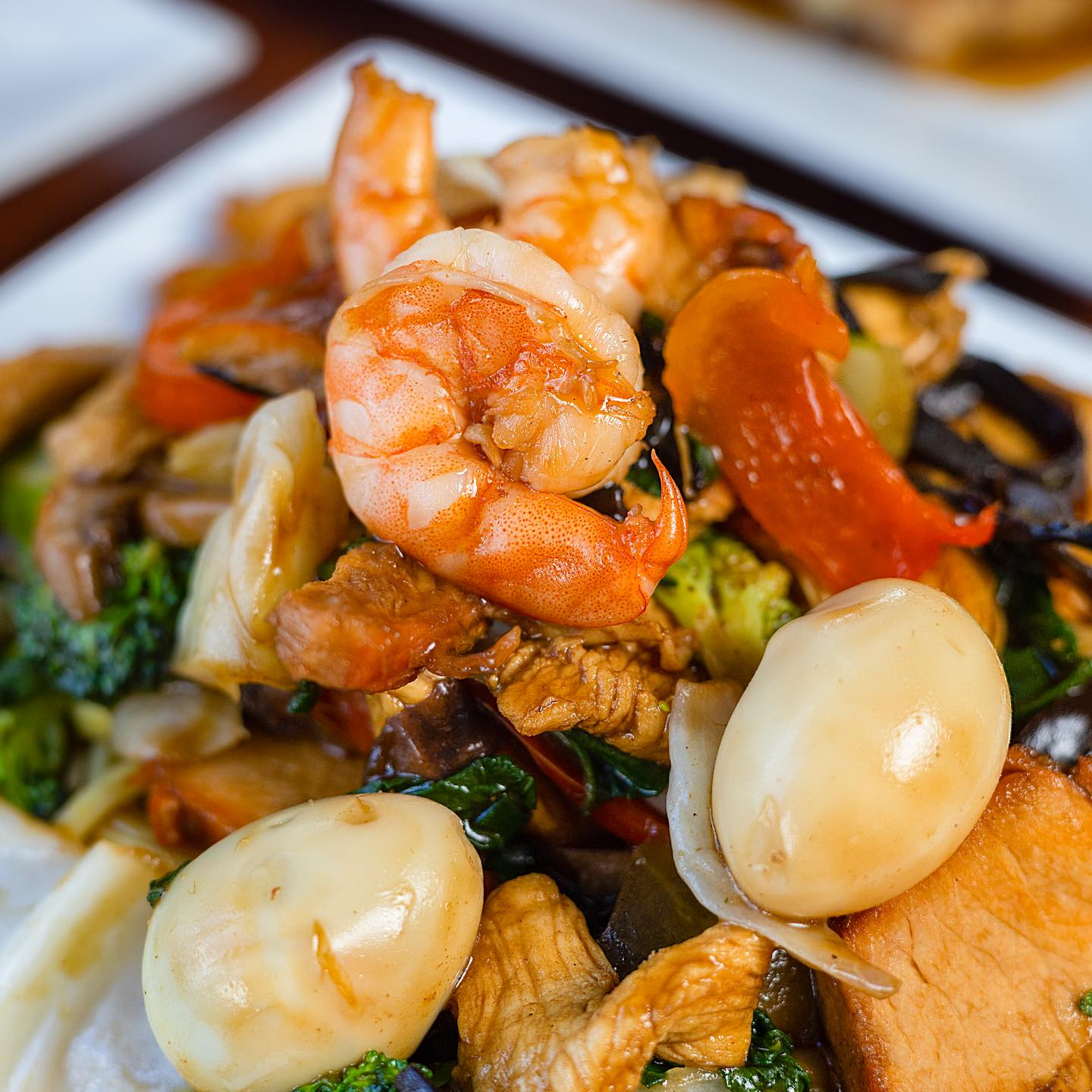 Incluye 1/2 Tallarín Tay Pa Especial al wok, 1/2 porción de Chi Jau Kay crocante en salsa especial, 1 porción de Chaufa Samsi tradicional, 1/2 porción de wantán frito, y 1 gaseosa de 1 litro. Perfecto para un grupo de tres personas.